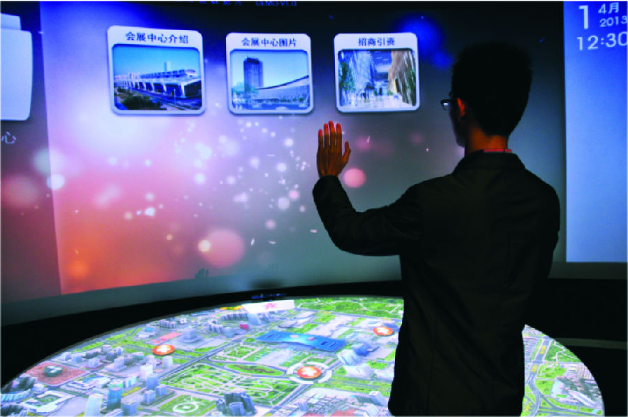 以計算機技術為核心的現代高科技手段生成逼真的三維圖像模型,借助投影顯示設備或其他顯示設備把計算機上的三維或四維圖形圖像模型顯示到臺面上 ……